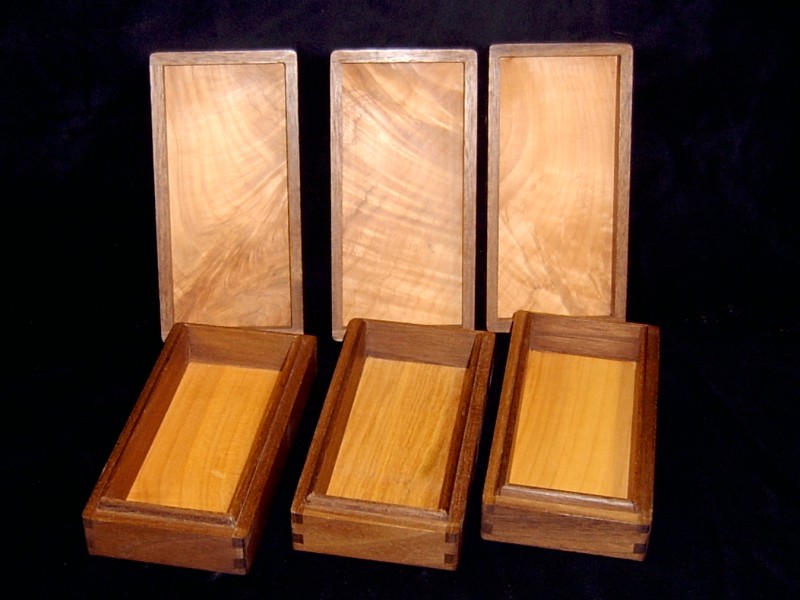 These boxes are made from Walnut with Maple crotch top and bottom panels. The dimensions are approx. 6" x 3" x 1.625" tall. The inside depth is .875". They are finished with a coat of drying oil and buffed with a coat of Canuba wax. All three are available for purchase. $Gifted |