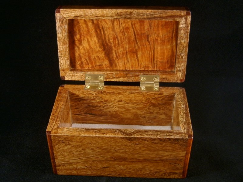 This box is made from Hawaiin Mango and premium Curly Koa top panel and accents. The dimensions are 4 3/4 x 2 3/4 x 2 3/4" high. It was finished with a drying oil on the inside and outside. The outside is finished with a French polish shelac and the whole thing buffed out with Carnauba wax. The hinges are made by Brusso and allow the box to be opened 180*. The liner is a suede material and will not tarnish silver. $100 |
