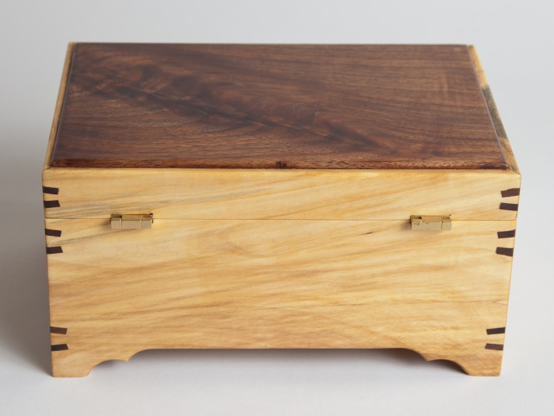 This box is made from Horse Chestnut with figured Walnut top panel, keys, and tray. It was made with a four corner grain match allowing the grain to flow around the box smoothly. The inside features a divided tray. There is also a false bottom providing a 1/2" deep secret storage area. The outer dimensions are approx. 9 " x 9 " x 5 3/4 " tall. Bottom area is 2 3/4" deep and the tray offer 5/8" depth. It was finished with a drying oil on the inside and outside. The outside is finished with shellac using a French Polish technique and the whole thing buffed out with Carnauba wax. The clasp & hinges are made by Brusso. Hinges allow the box to be opened 180*. The liner is a velvet type material. $ 175 |
